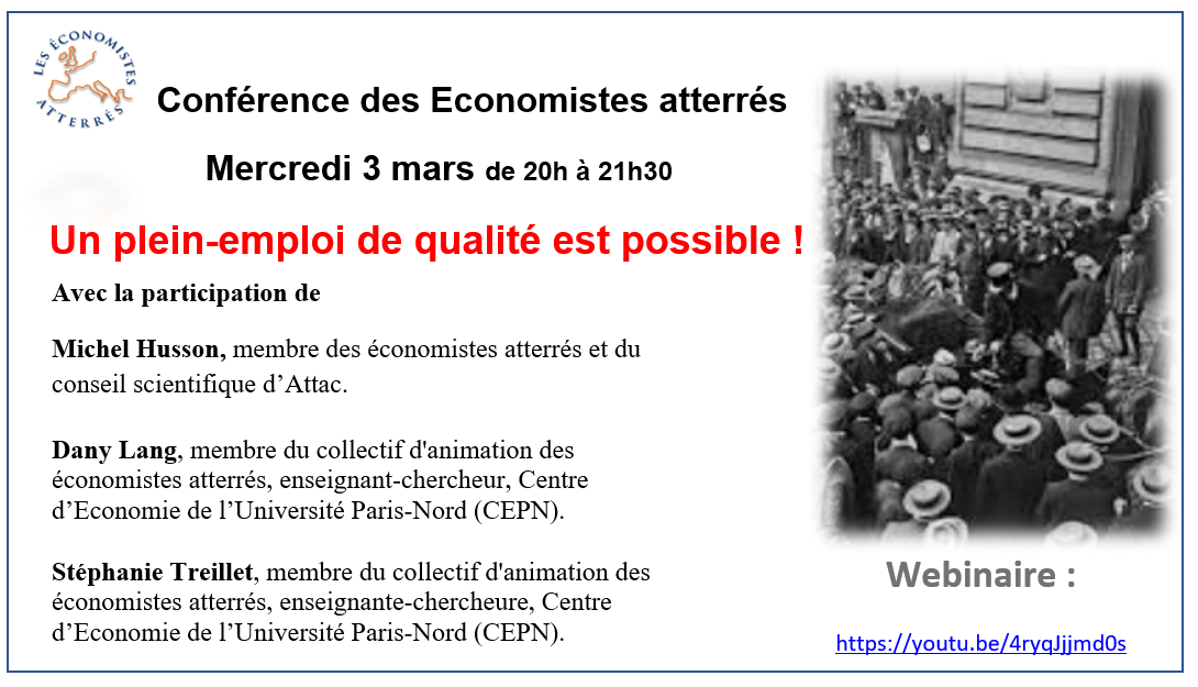 Le mercredi 3 mars 2021, le collectif des Economistes atterrés organise une visioconférence sur les politiques alternatives possibles en matière de lutte contre le chômage et de défense de l’emploi, à même de répondre aux défis posés par la crise écologique, sociale et économique. Cette conférence, accessible sur YouTube et Facebook se tiendra de 20H00 à 21H30, avec la participation de Michel Husson, Dany Lang et Stéphanie Treillet, tous trois membres des Economistes atterrés.